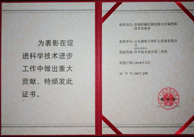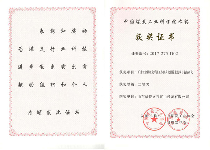 巖巷機械化掘進粉塵污染控制技術(shù)及裝備科學(xué)技術(shù)進步獎